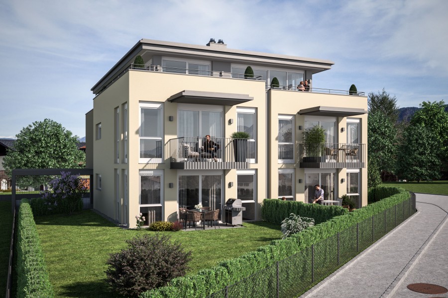 In der Kastengstatter Straße 18 in Kirchbichl entsteht eine kleine Wohnanlage mit sechs Einheiten zwischen 49 und 99 m² in fußläufiger Entfernung zum Zentrum. Das Gebäude wird über eine zentrale Pelletsanlage beheizt und wird im Sommer 2025 fertiggestellt. Die Penthouse-Wohnung bietet eine große Dachterrasse und einen sonnigen Blick nach Westen.